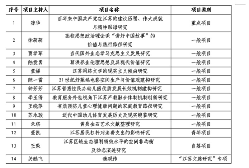 近日,江苏省哲学社会科学规划办公室公布了2021年度江苏省社科基金项目立项评审结果,我校共12个项目获得立项。